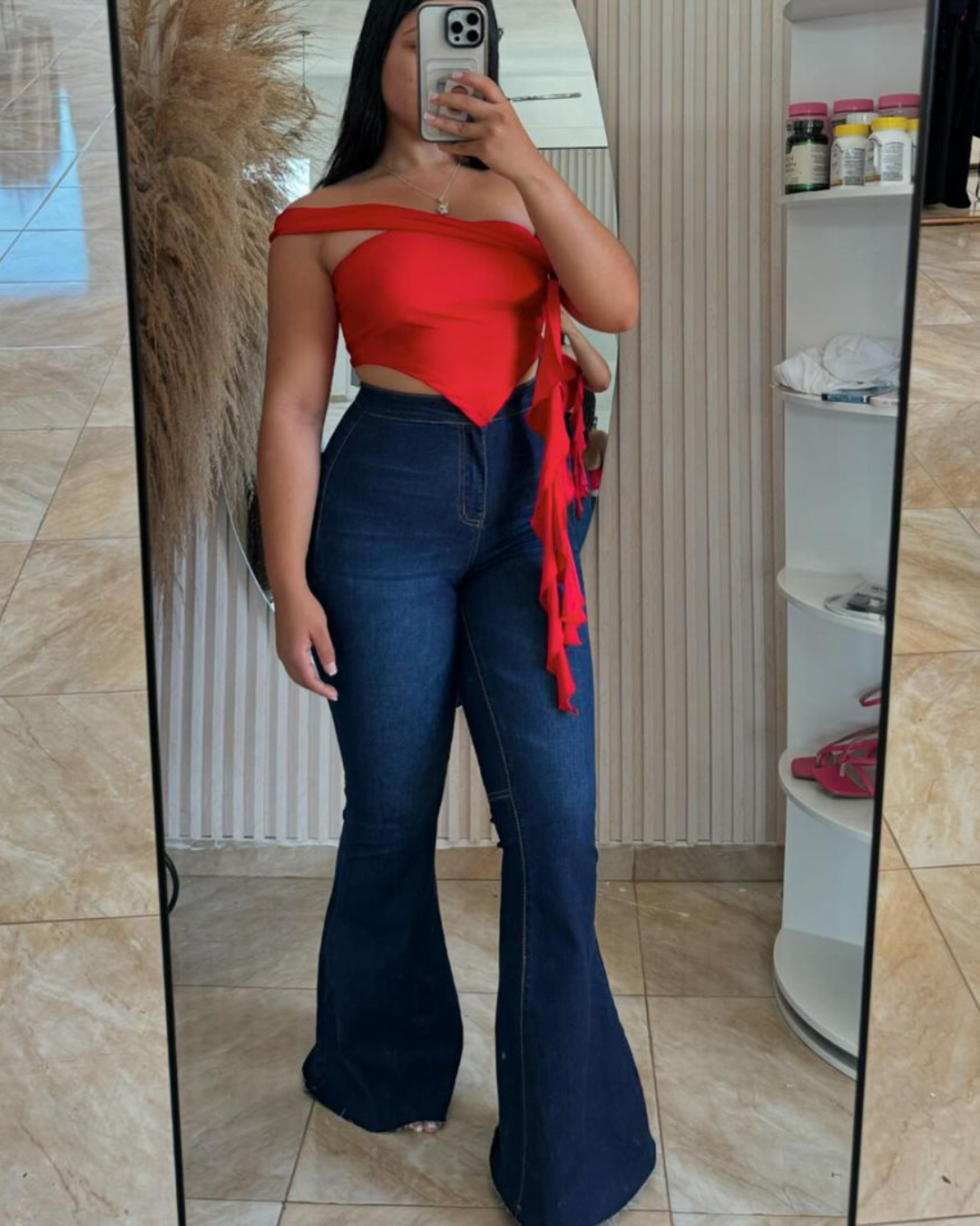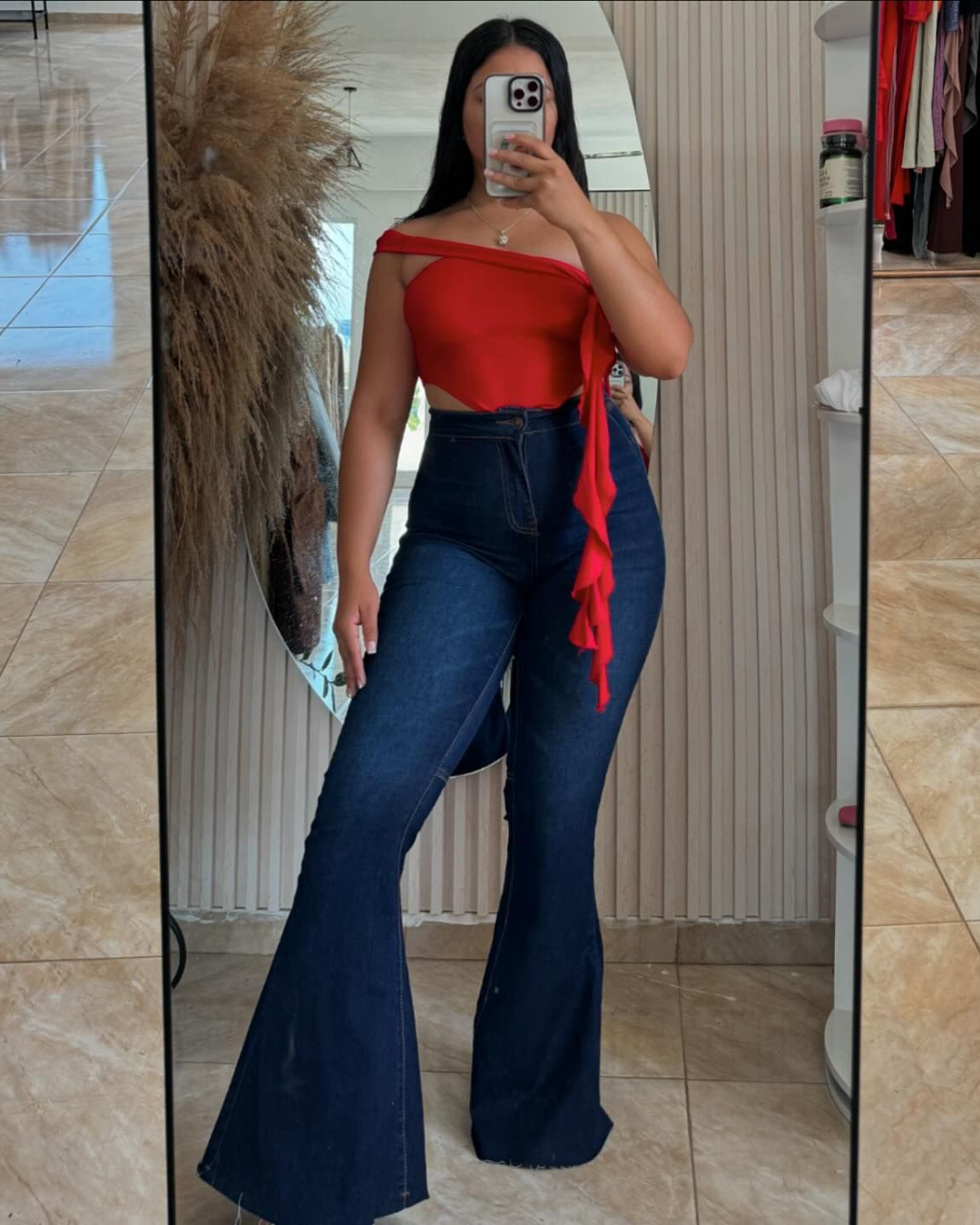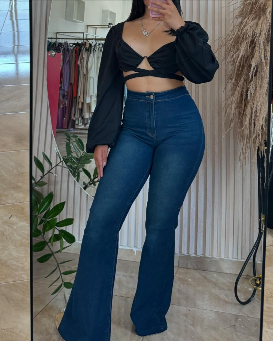 El pantalón estilo campana con corte alto ofrece un ajuste que realza la cintura, creando una silueta definida y elegante. Este diseño estiliza la figura, brindando una sensación de seguridad y sofisticación para cualquier tipo de cuerpo.